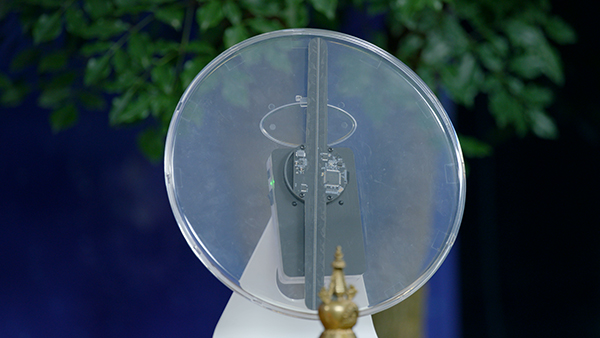我们可以借助一个新的道具来看,这是之前简单道具的升级版。它由一个圆形半透明的玻璃板,一个黑色长条状的扇叶以及一些电子元器件组成,扇叶上排列着大概200多个光点,除此之外没有其他东西了,这就是这个道具本来的样子。插上电源,打开开关,扇叶会以圆形玻璃板的圆心为轴快速转动,同时扇叶上的各色光点会发亮,这时就会出现释迦牟尼佛、达摩祖师等不同的图像。