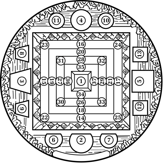 这些树枝之间充满智慧和业所成的护法,男性护法面朝外,表示遣除外面的障碍;女性护法面朝内,表示阻止内悉地外流。每一尊佛菩萨都具足智慧、慈悲、能力,功德不可思议,是将自己和一切众生从轮回苦海中救度的唯一怙主。各自身上发出同于自身色之光。